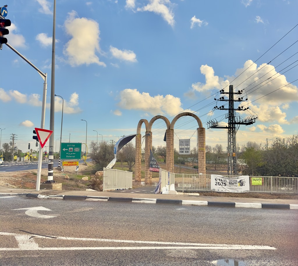 Leaving the festival site, we drove along Route 232, the Blood Highway, past the Black Arrow memorial commemorating a 1956 battle and the Mefalsim Bend, where terrorists set up deadly ambushes killing dozens of civilians. The three arches may be familiar to viewers of the movie “The Road Between Us”, which tells the Oct 7 story of how a father rescued his son’s family who were trapped in their safe room at Kibbutz Nahal Oz, under siege by terrorists.