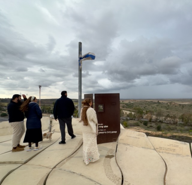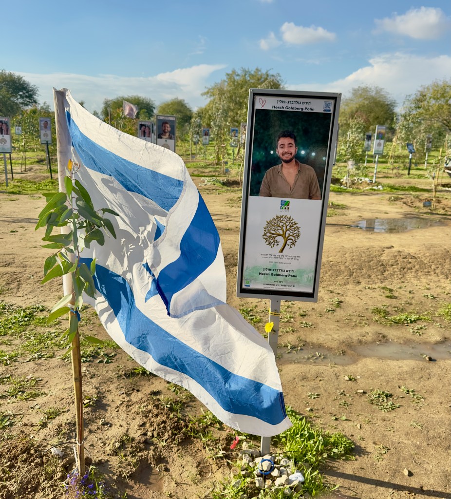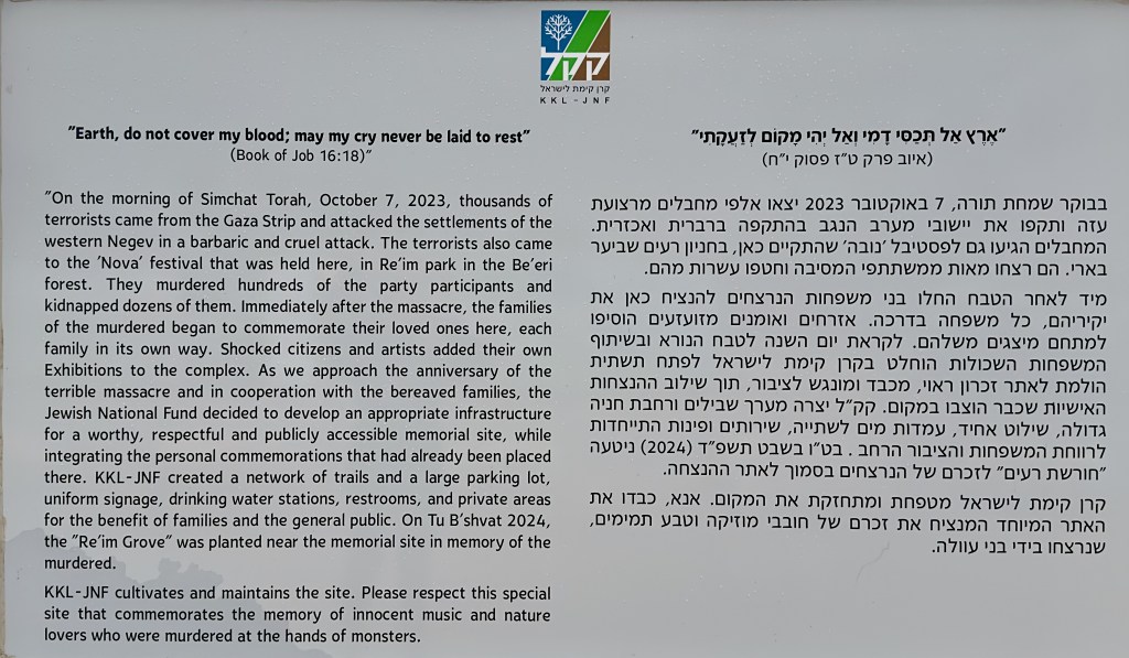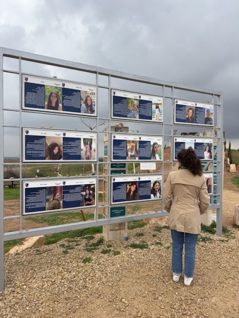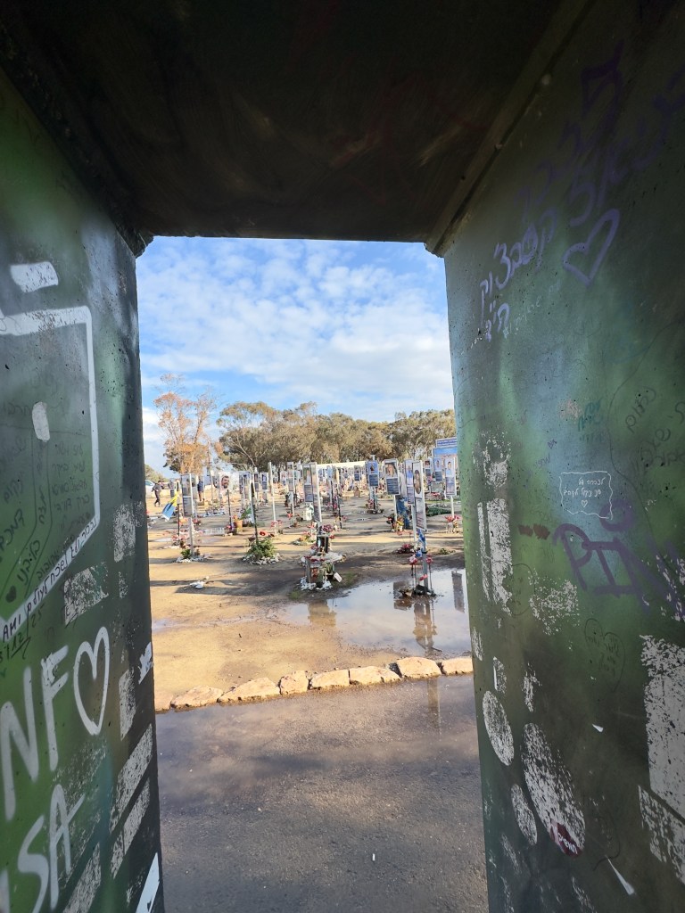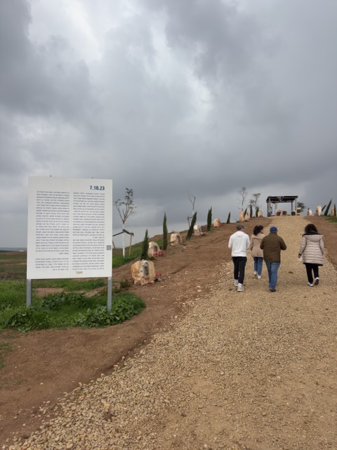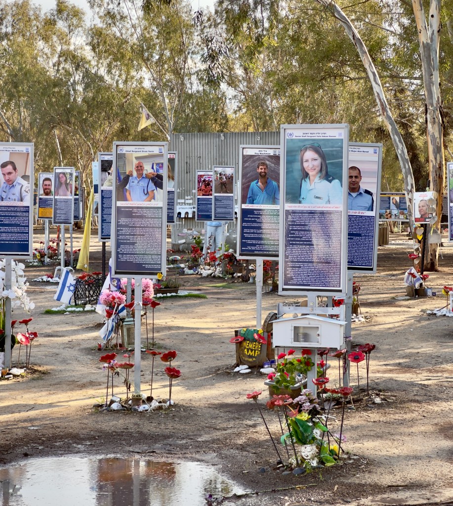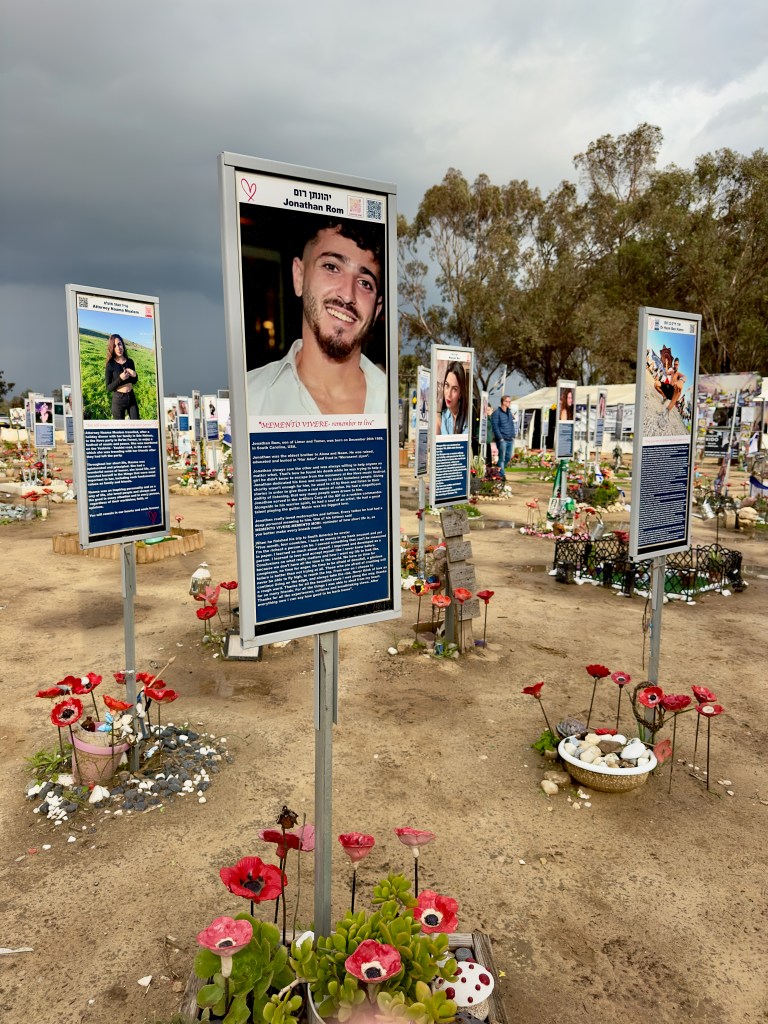 Down the way from the Nahal Oz memorial we drove to the site of the Nova festival. The asphalt on the road leading to Nova was still scarred by the tracks of army tanks from over two years ago. As we got out of our car, the bad weather briefly broke and the sun came out, a symbolic reminder of the shining young lives lost that day. We wandered awkwardly around the site, looking at the pictures of the murdered, reading about them, remembering the hundreds of young lives horribly cut short.