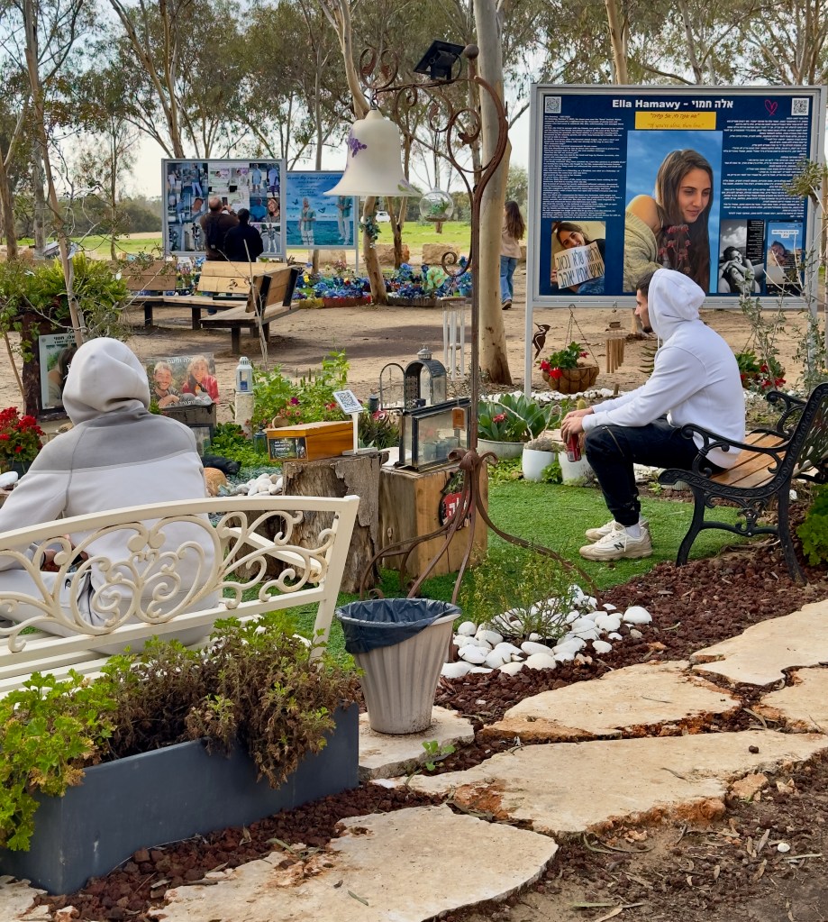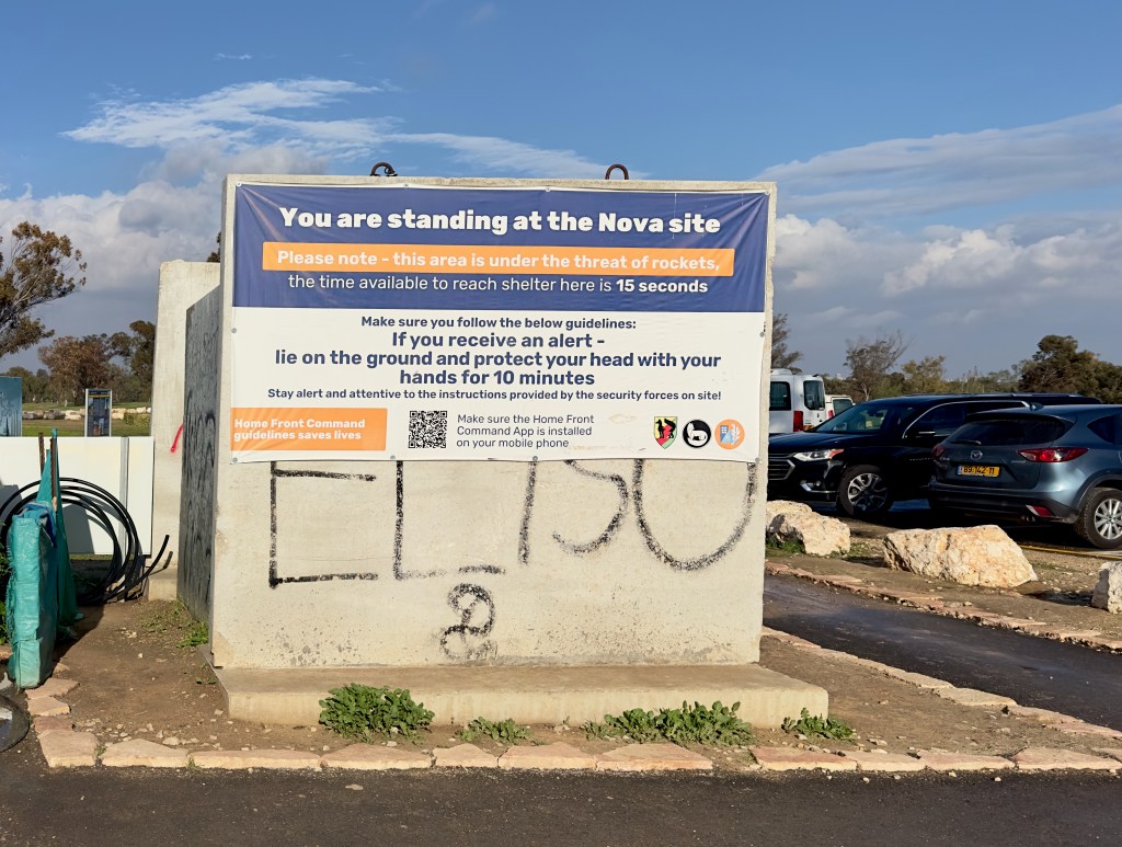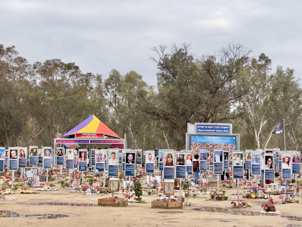 Thousands of ceramic bright red anemones lay in the ground all around the memorial plaques. These wildflowers carpet the fields of southern Israel in early spring each year and symbolize the notion of blooming again amidst loss. We walked around the Nova site for some time with heavy hearts, mourning the hundreds of beautiful young faces that stared at us from the signs. There are simply no words to describe the horror of this mass murder.