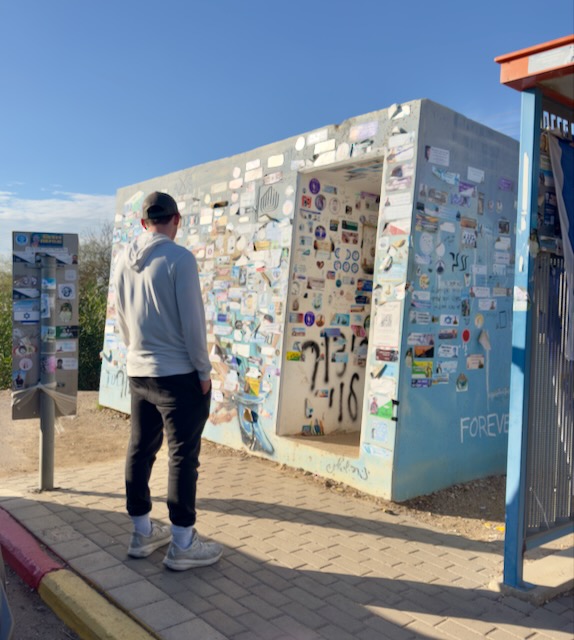We stopped at a roadside bomb shelter where some of the festivalgoers fleeing Nova attempted to seek refuge, only to be bombarded by terrorist grenades. This was the shelter where Hersh Goldberg-Polin’s arm was blown off. The outside walls were plastered with stickers of hostages. Inside, the floor was covered with burnt memorial candles.