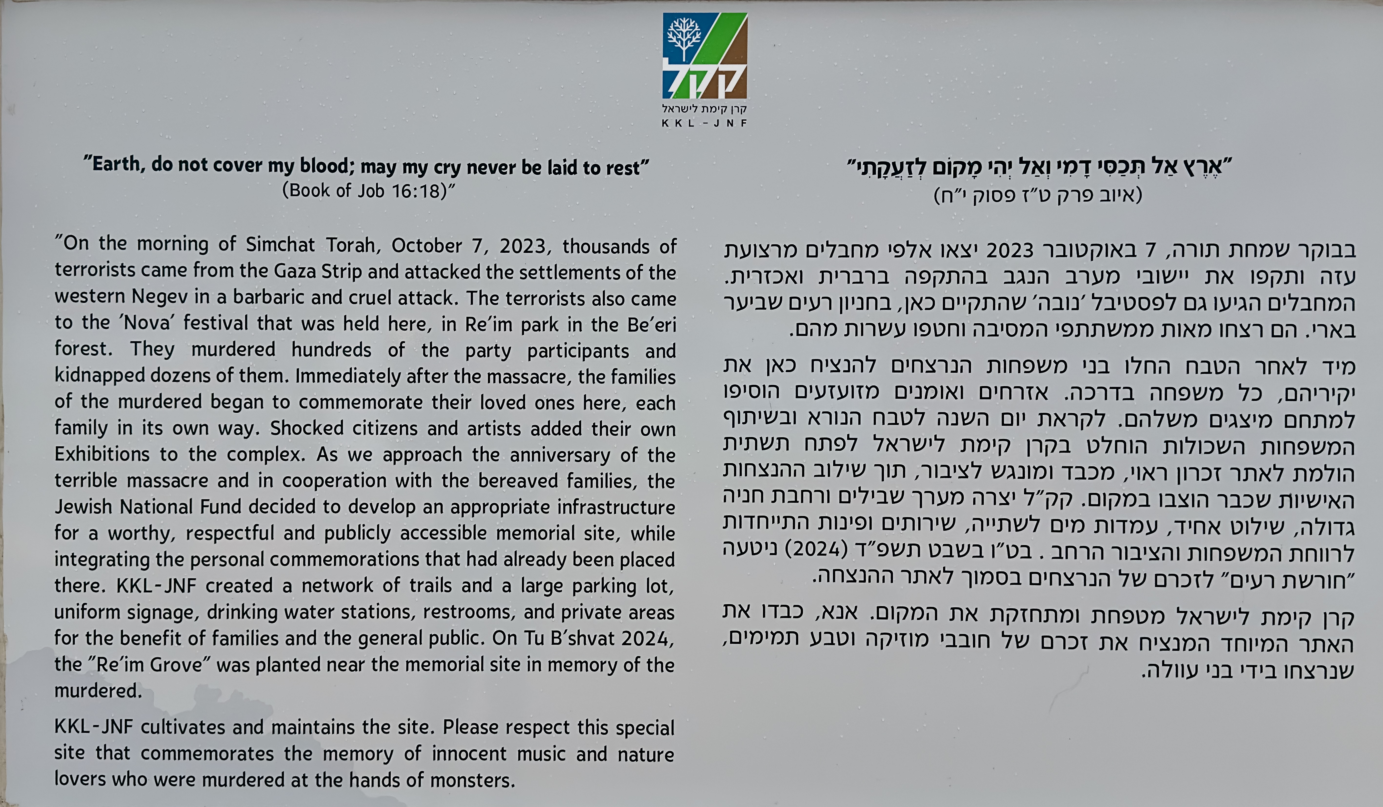 In the days and weeks following October 7, friends and relatives of the slain put up handmade signs. These makeshift memorials have now been replaced with uniform blue and white plaques designed by artist Amir Chodorov and funded by JNF. The signs tell each victim’s story in Hebrew and English. JNF has also created pathways, a parking lot and other infrastructure for visitors to the site.