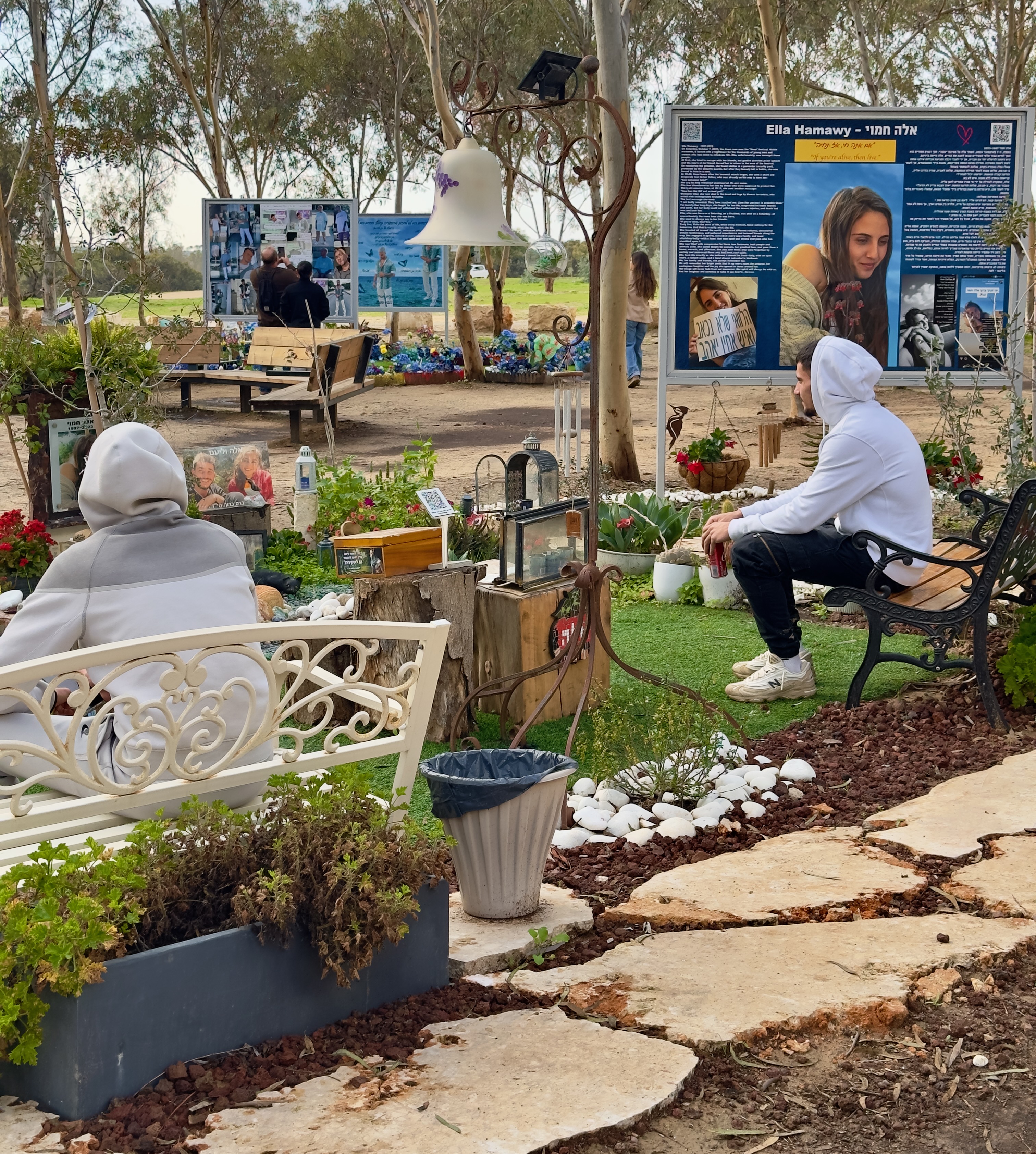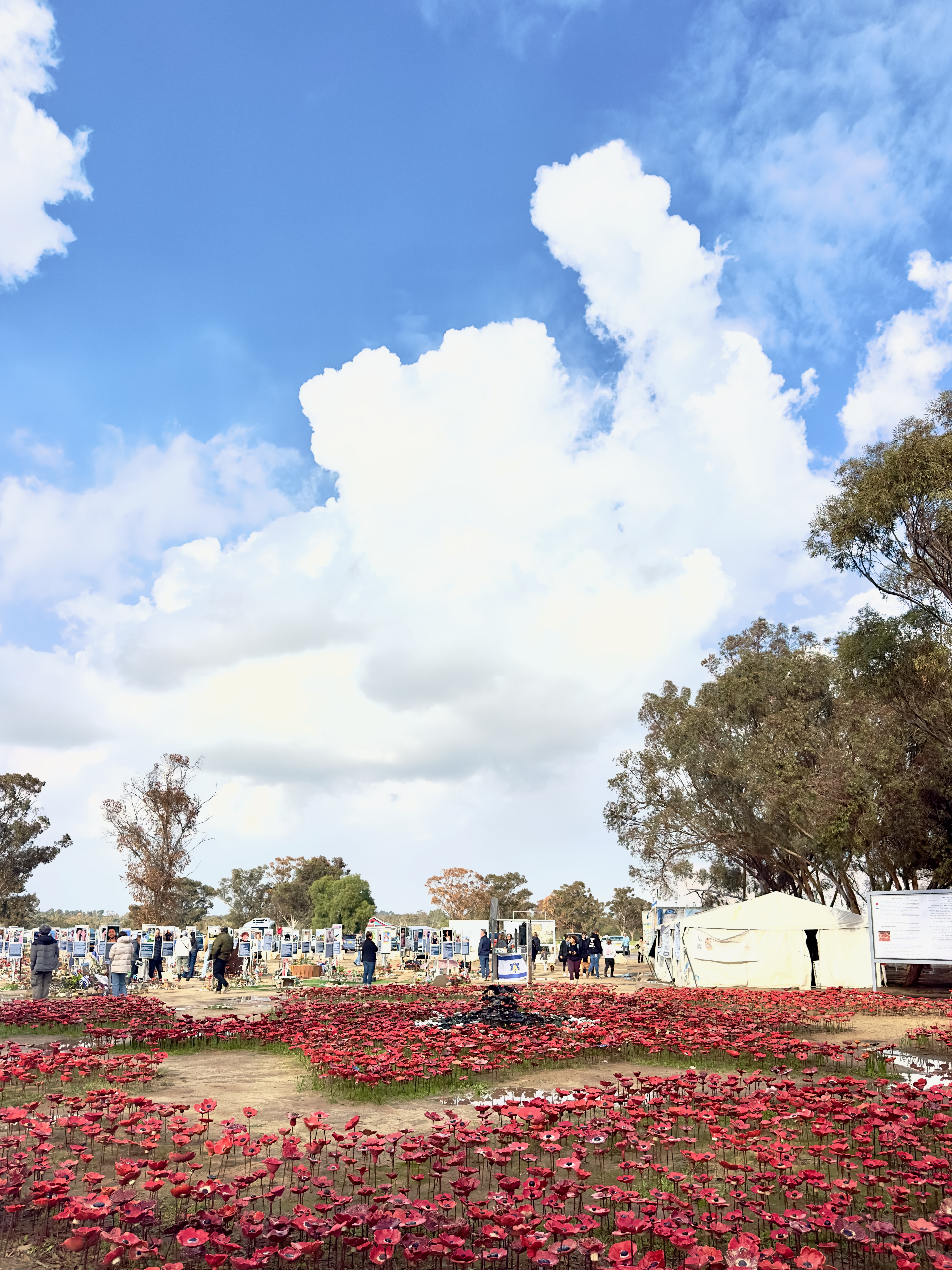 Thousands of ceramic bright red anemones lay in the ground all around the memorial plaques. These wildflowers carpet the fields of southern Israel in early spring each year and symbolize the notion of blooming again amidst loss. We walked around the Nova site for some time with heavy hearts, mourning the hundreds of beautiful young faces that stared at us from the signs. There are simply no words to describe the horror of this mass murder.
