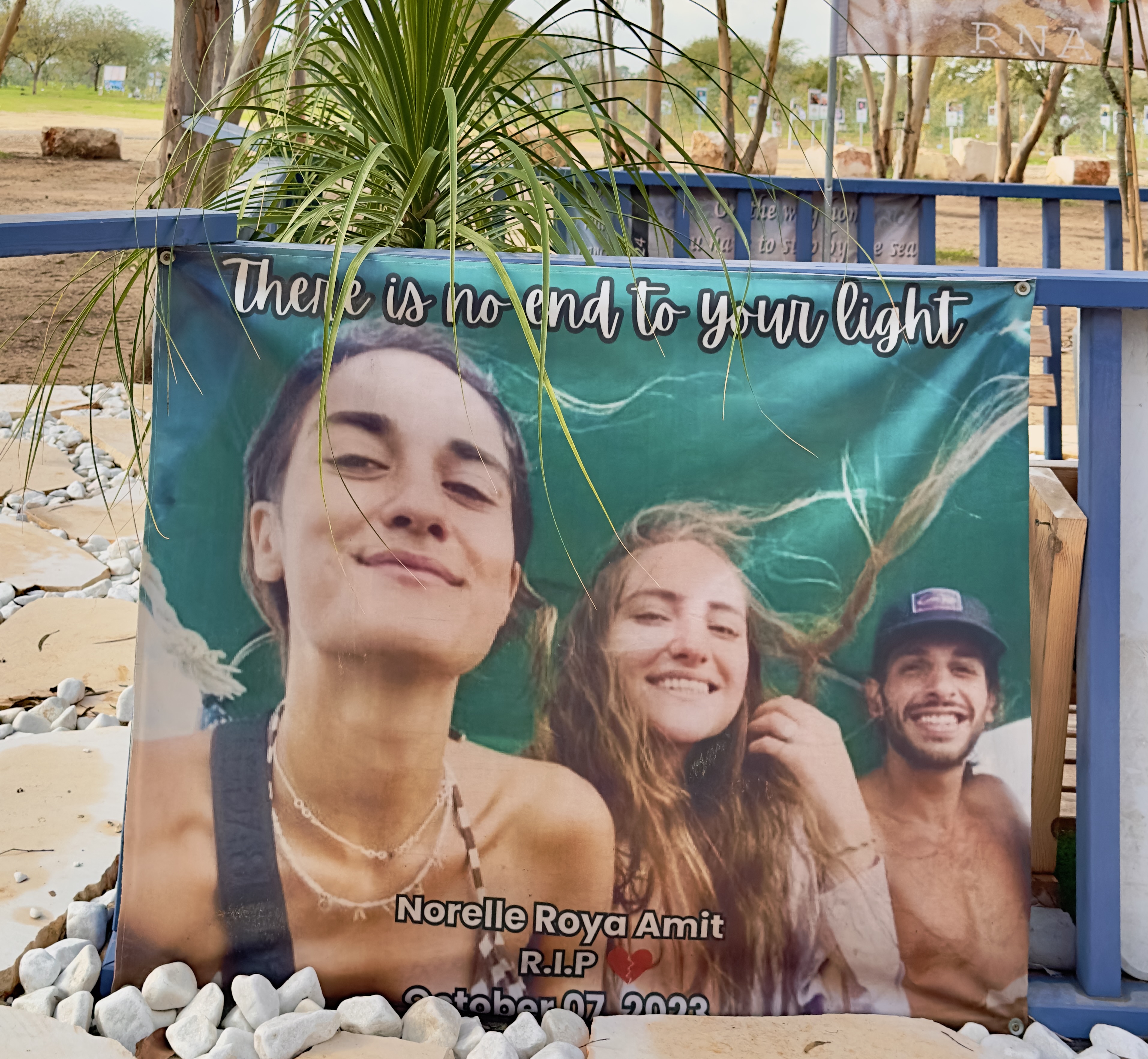 Down the way from the Nahal Oz memorial we drove to the site of the Nova festival. The asphalt on the road leading to Nova was still scarred by the tracks of army tanks from over two years ago. As we got out of our car, the bad weather briefly broke and the sun came out, a symbolic reminder of the shining young lives lost that day. We wandered awkwardly around the site, looking at the pictures of the murdered, reading about them, remembering the hundreds of young lives horribly cut short.